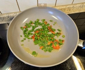 • Lauchzwiebeln und Chili darin ca 2 Minuten dünsten.