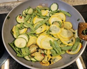 • Zuckerschoten und Zucchini zufügen und ca 5 Minuten mitdünsten.