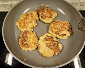 - 1 EL Krautmasse pro Küchle in die Pfanne geben und flach drücken.