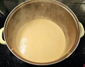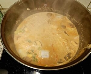 - Kokosmilch, Erdnusscreme, rote Currypaste, Sojasauce und Gemüsebrühe in einem großen Topf erhitzen und gut verrühren.