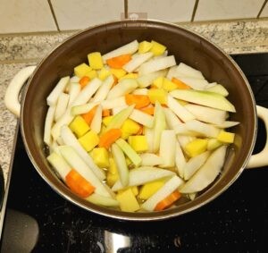 - Gemüse hineingeben und kräftig mit Salz würzen, da die Kartoffeln Salz ziehen.
