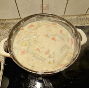 - Speisestärke mit Weißwein, bzw Wasser verrühren, in die Brühe geben und schnell verrühren damit keine Klümpchen entstehen.