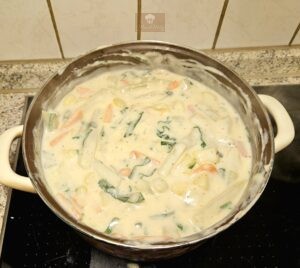 Manchen wird die Menge der Brühe zu wenig vorkommen. Da aber das Gemüse auch noch Flüssigkeit abgibt, passt es am Ende.