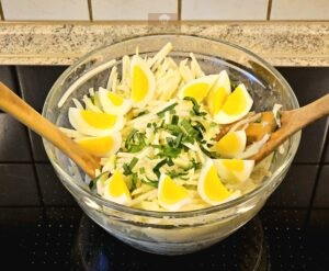 - Essig, Öl, Mayonnaise, Senf, Salz, Pfeffer und ggf. Xylit verrühren und über die Kohlrabistifte geben.